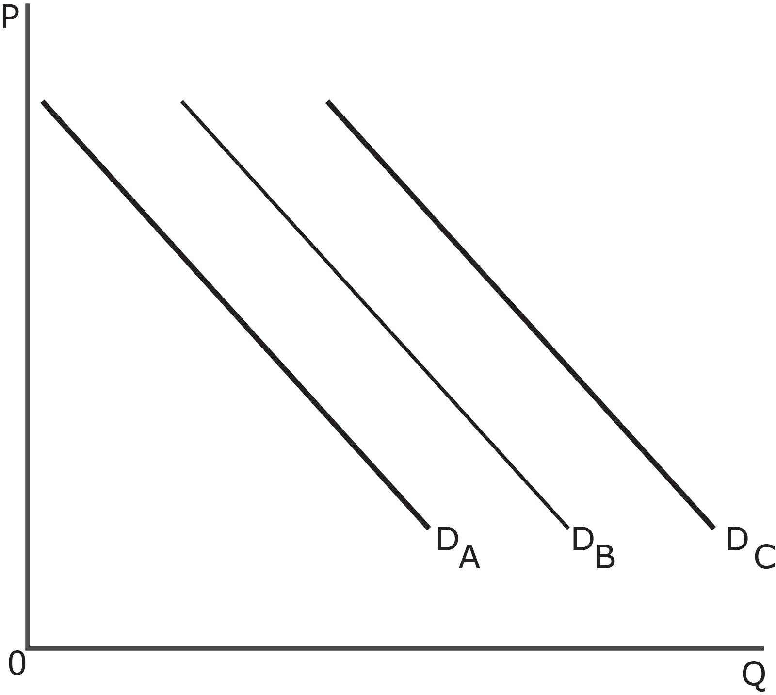Which of the following would cause the demand curve to shift from Demand B to Demand C in the market for bubble gum?