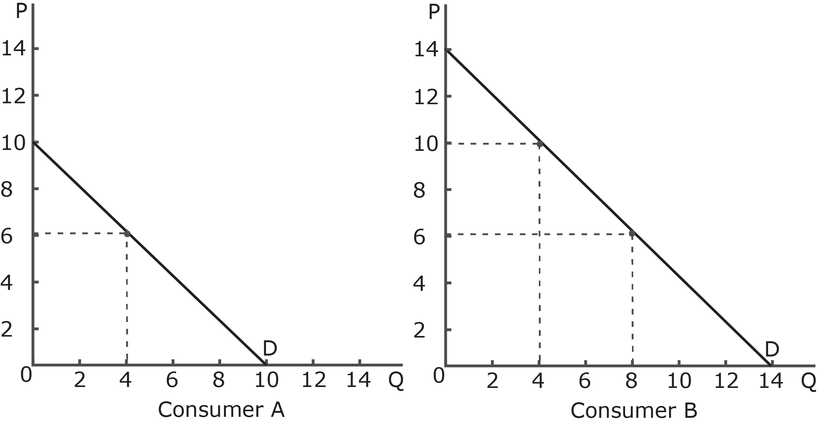 If Consumer A and Consumer B are the only consumers in the market, then the market quantity demanded when the price is R6 is