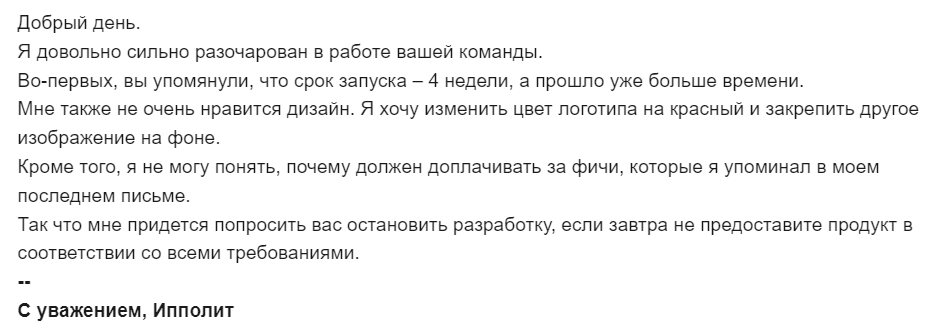 Вы руководитель проекта. Начинается рабочий день. Вы получаете письмо от клиента: