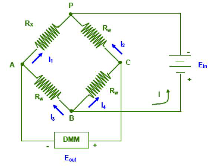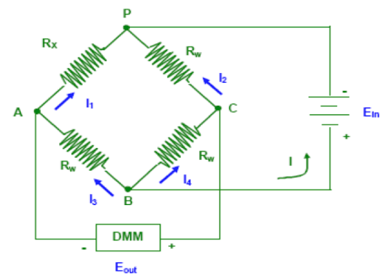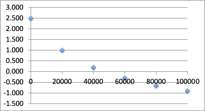 You are using the following circuit with an input voltage Ein of 5 Volts. Rx is a variable resistance, while Rw are of fixed and equal values. If Rx is varied from 0 (cero) to 100 kOhms in steps of 20 kOhms, and you obtain the behavior in the plot to the right, what is the value of Rw ?