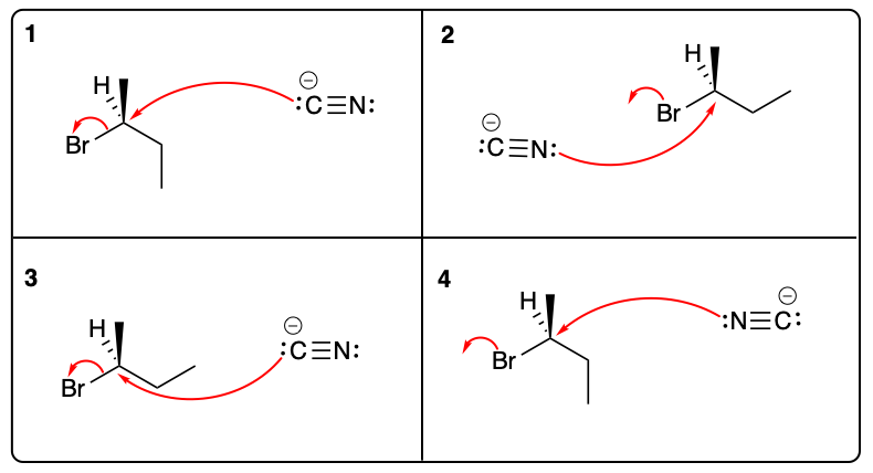 Entre los mecanismo 1 al 4 escoja el mecanismo correcto para la siguiente reacción SN2.