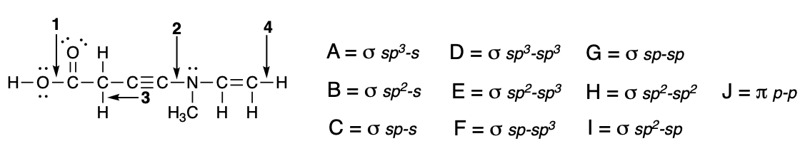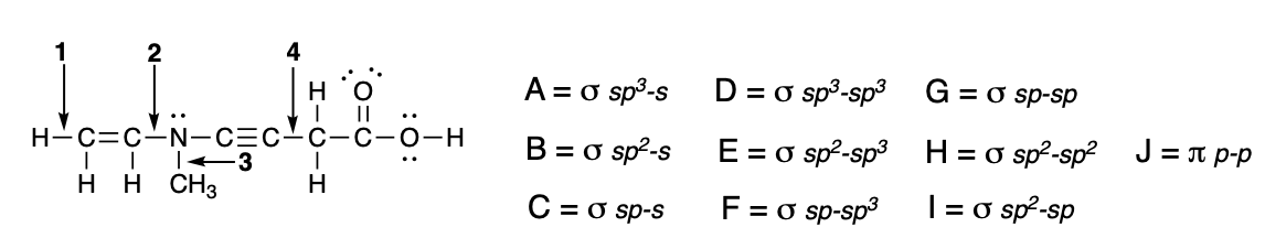 Identifique cada enlace enumerado en la siguiente molécula utilizando utilizando la leyenda provista para los diferentes tipos de enlaces sigma y pi: