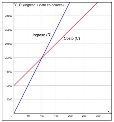 De la gráfica de las ecuaciones de costo (C) y de ingreso (R). La ecuación del Ingreso es: