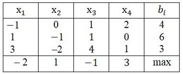 У симплекс-таблиці записані дані вихідного завдання лінійного програмування. Яку змінну доцільно вводити в базис завдання на максимум?