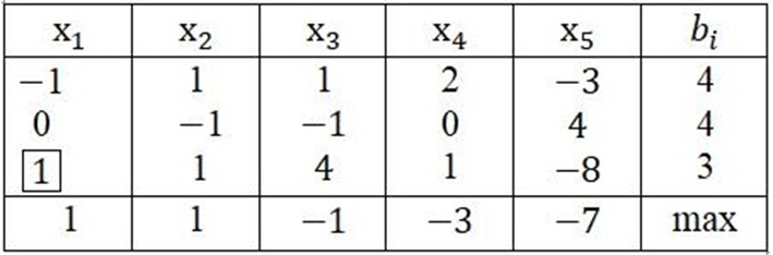 У симплекс-таблиці записані дані вихідної задачі лінійного програмування та виділено ключовий елемент. Обчисліть нове значення коефіцієнта