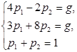 Для матричної гри система рівнянь для знаходження оптимальної стратегії X*(p1;p2} гравця а и ціни гри g має вигляд…}
