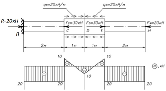 На яку кількість ділянок треба поділити даний стержень для побудови епюри N?