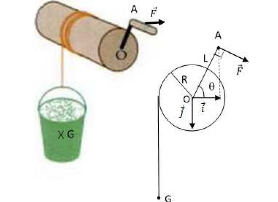 Soit un puits, considérons le système S constitué d'un cylindre sur lequel s'enroule la corde (de masse négligeable) tenant le seau solidaire de la manivelle pour remonter le seau. On exerce une force, dont la norme F est constante, sur l'extrémité de la manivelle. Cette force est perpendiculaire à la manivelle de longueur OA=L, et permet de remonter le seau d'eau de masse m sur la hauteur h. Le système est immobile (). Après avoir analysé le problème, étant données les valeurs numériques de l'énoncé calculer la valeur de m. On donne :