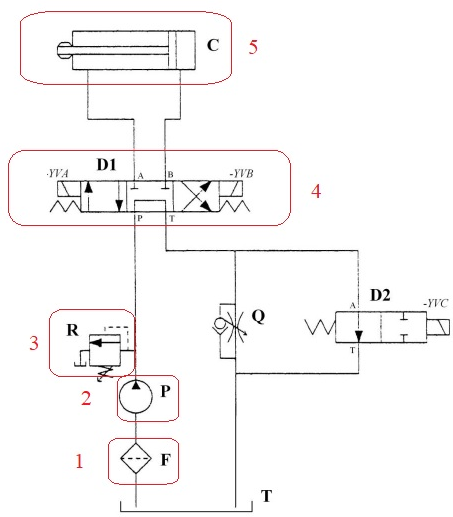 On donne le schéma d'un circuit de puissance hydraulique :