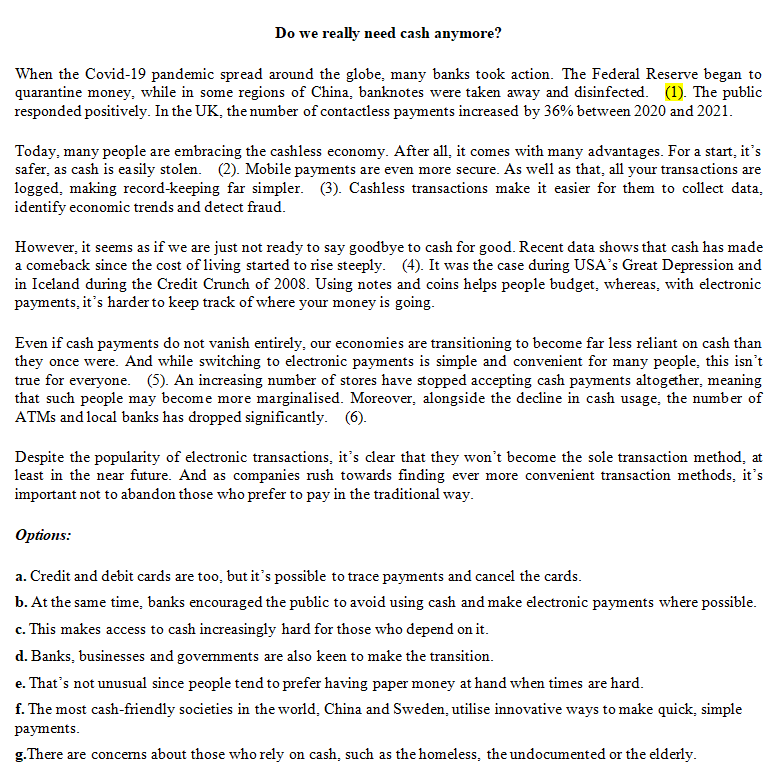 Read an article about the rise of a cashless society, and for question 1, type the appropriate letter for the correct answer.