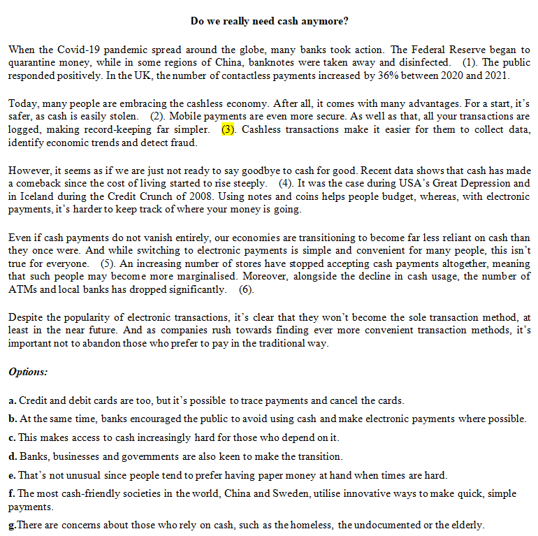 Read an article about the rise of a cashless society, and for question 2, type the appropriate letter for the correct answer.