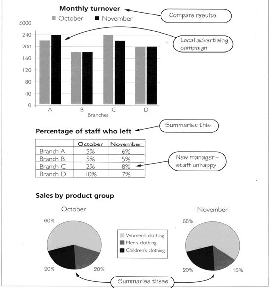 You work for а small chain of clothing stores. The Managing Director has asked you to write а short report on last month's performance. Look at the charts and tаblе below, on which you have already made some handwritten notes. for your Managing Director.