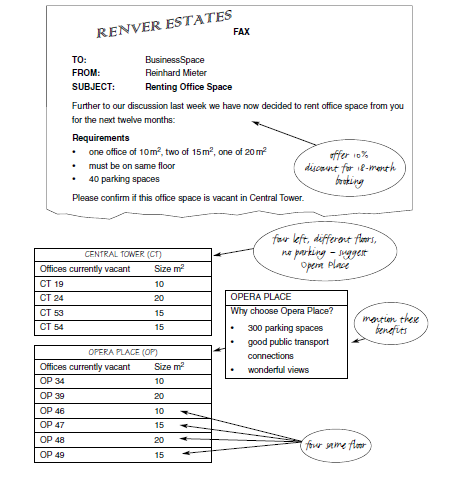 Task 7. You work for BusinessSpace plc, a company which rents fully serviced offices to other businesses. You have just received the fax below. Look at the fax and other information below, on which you have already made some handwritten notes. Then, using all your handwritten notes, write a fax in reply to Reinhard Mieter. Write 120-140 words.