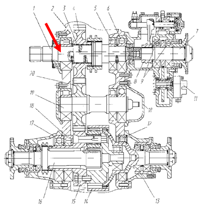 На чертеже раздаточной коробки МАЗ с коробкой отбора мощности для привода пожарного насоса стрелкой указан
