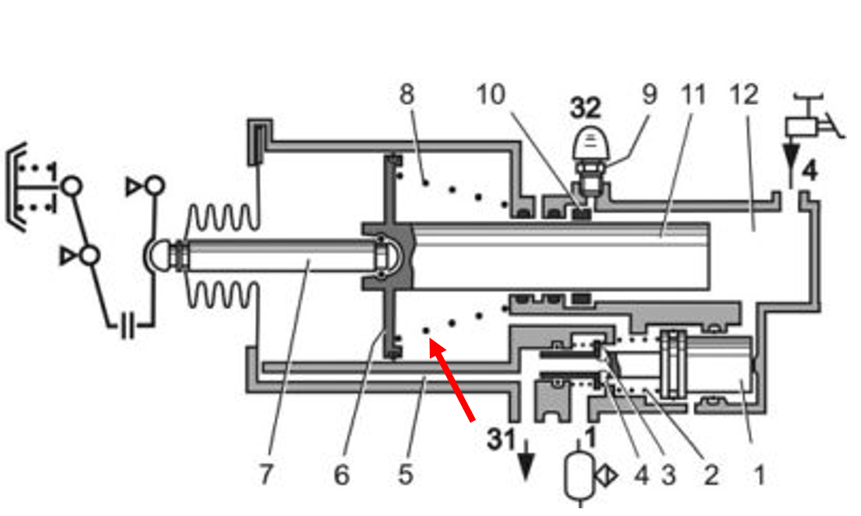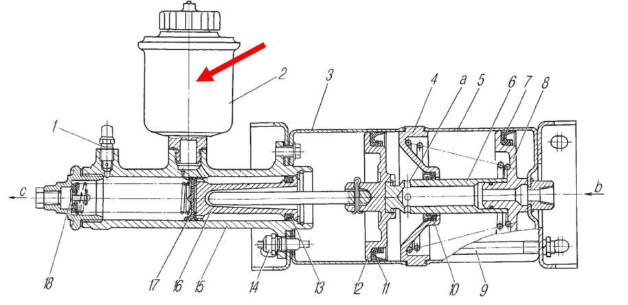 На схеме пневмогидроусилителя тормозов Урал-4320 стрелкой указан