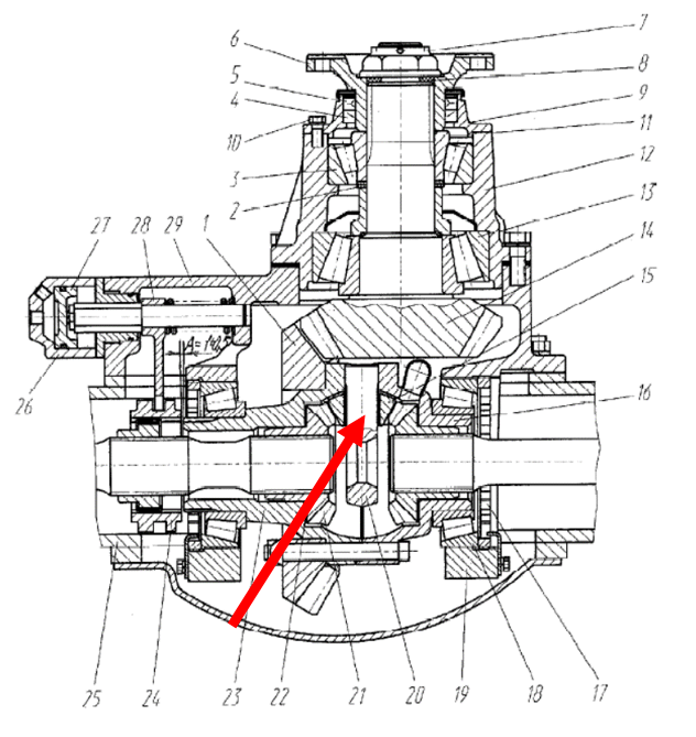 На рисунке центрального редуктора главной передачи заднего моста стрелкой указан