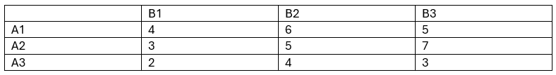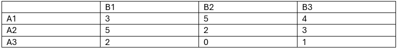 Two players A and B compete in a zero-sum game. The payoffs for player A are given in the following 3x3 matrix: