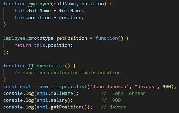 For the given source code, you need to implement the IT_specialist constructor function, which takes 3 parameters: fullName, position, salary and prototypically inherits from Employee. Indicate which of the prototypal inheritance implementations is correct.