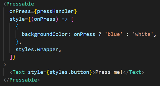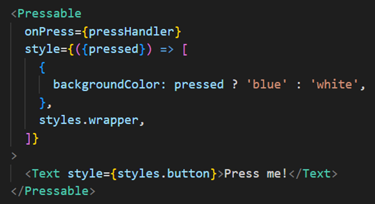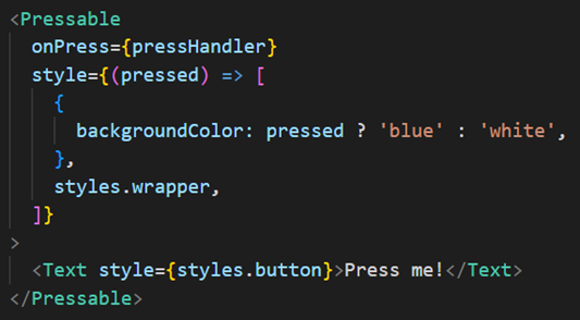Choose the correct way to implement the Pressable component, which, using the style function, ensures that the background color of the element is changed to blue when the text 'Press me!' is pressed.