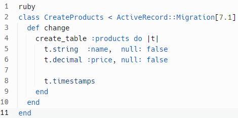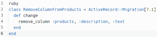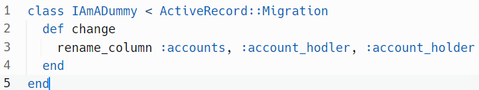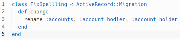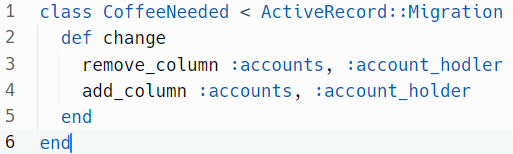 You made a spelling mistake while creating a table for bank accounts. Which code would you expect to see in a migration to fix the error?