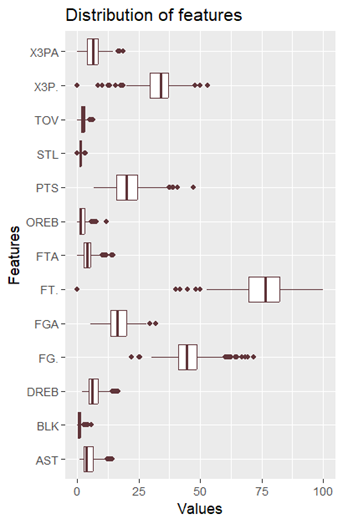 The graph provided below displays the distribution of each of the thirteen features. What three features will influence the distance calculation the most?