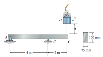 A simply-supported overhanging steel beam (E = 200 GPa) is shown below. A 95-kg mass is dropped from a state of rest, from height h onto the end of the beam.