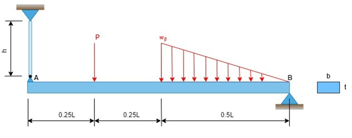 A steel beam with a rectangular cross-section is pin-supported at one end and hanged with an aluminium rod of diameter (25 mm) on the other. If the beam is loaded as shown in the figure below, and P=13 kN, wo=16 kN/m, b = 120 mm, t = 105 mm, L = 2 m and h = 1.2 m