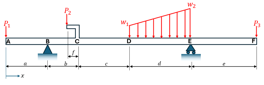 A beam with simple supports at B and E is loaded as shown. Given that 𝑃1=11kN, 𝑃2=9kN, 𝑃3=10kN, 𝑤1=18kN/m, 𝑤2=24kN/m, 𝑎=𝑏=𝑐=1m, 𝑑=𝑒=2m, and 𝑓=0.4m,