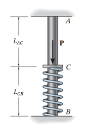 An aluminium (E = 70 GPa) post with a diameter 50 mm. It is securely attached to a structure at A and B. A coiled spring (spring constant 156 MN/m) that is originally uncompressed (before P is applied) is placed over section CB, between the rigid collar at C and the fixed support at B. The lengths LAC = 0.23 m and LBC = 0.37 m.