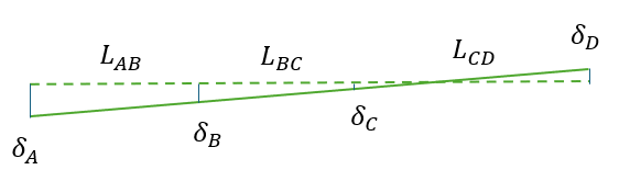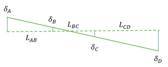 The dashed line is the original horizontal position (datum) of beam ABCD. Make sure that the bar elongations match the stress states: for a elongation above the datum, the bar will be in tension, and visa versa.