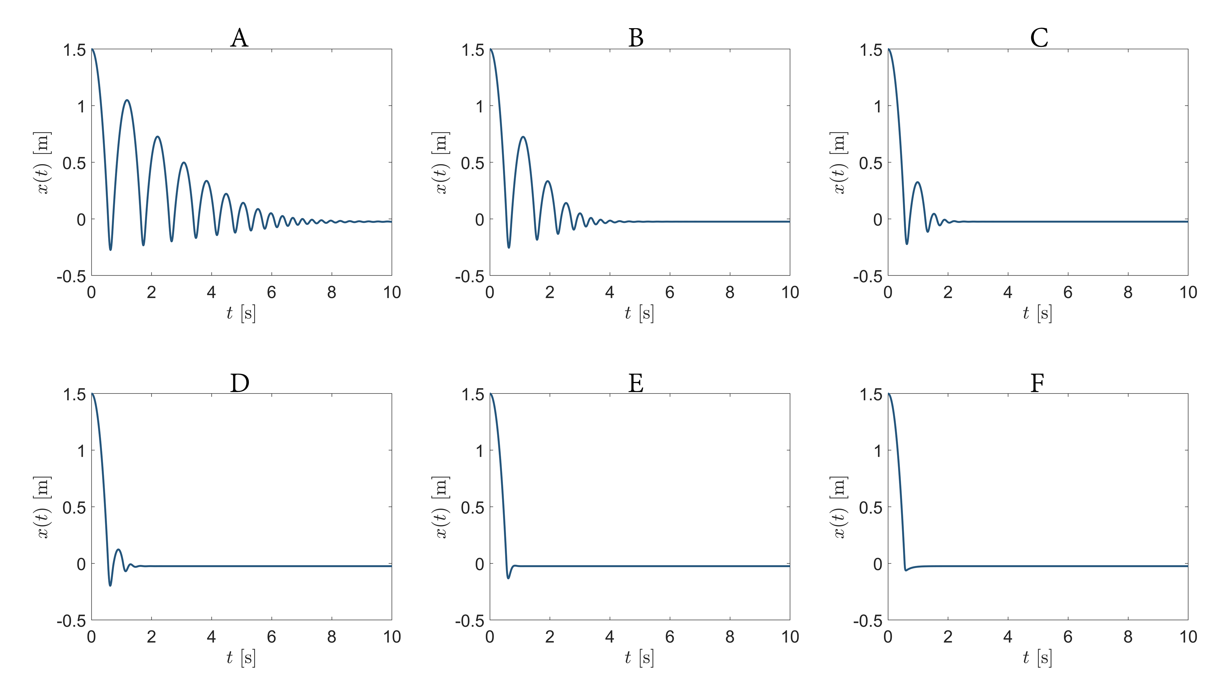 The plots (A to F) represent the response of the mass in Task 1, , for different damping values when