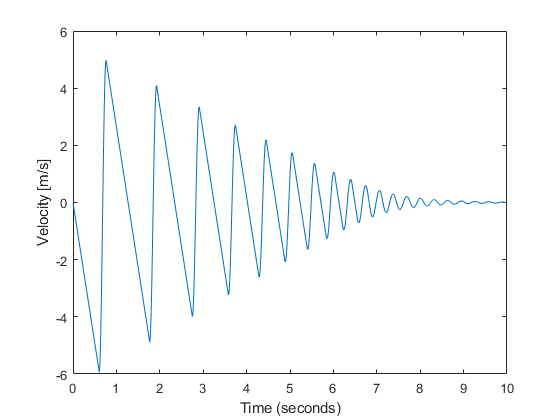 Using the Simulink model that you created for Task 1, select the damping coefficient and initial height of the mass that produces the velocity profile shown below.
