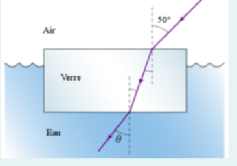 1. L’angle critique pour la réflexion totale interne d’un morceau de verre dans l’air est de 42°. Comment change l’angle critique si on place le morceau de verre dans l’eau (n = 1,33) ?