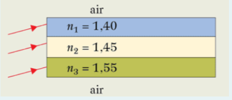 La figure suivante montre trois lames de plastique ayant des indices de réfraction différents, entourées d'air. On envoie une lumière à l'extrémité gauche de chaque lame. Dans quelle lame la lumière pourra-t-elle se propager sans en sortir ?