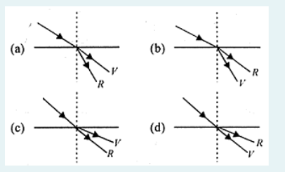 Un faisceau de lumière composé de lumière rouge et violet passe de l’air à l’eau. Sachant que l’indice de réfraction de l’eau est plus grand pour le violet que pour le rouge, quelle figure représente correctement la réfraction de la lumière dans l’eau ?