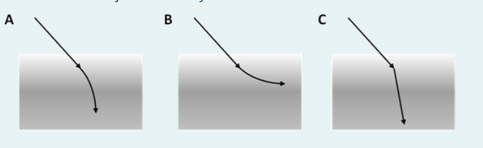 Un rayon lumineux entre dans une substance dont l’indice de réfraction augmente avec la profondeur (en partant d’une valeur de = 1 à la surface). Laquelle des figures suivantes montre correctement la trajectoire du rayon lumineux dans cette substance ?