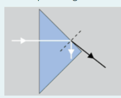 De la lumière blanche frappe un prisme à incidence normale, comme le montre la figure. Lorsque la lumière frappe la deuxième interface, certaines longueurs d'onde subissent une réflexion totale interne, et certaines longueurs d'onde sont réfractées. Est-ce la lumière rouge ou la lumière violette qui émerge (sort) du prisme ?