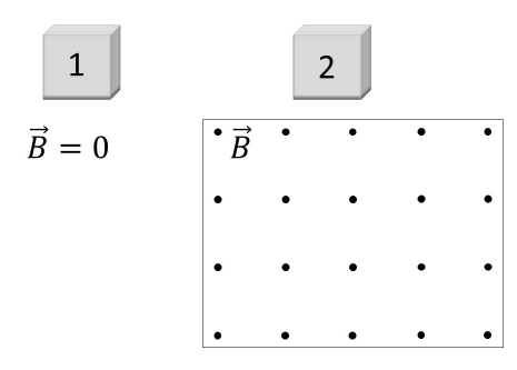 On laisse tomber deux gros blocs métalliques d'une même hauteur et en même temps. Le bloc 1 tombe dans une région où le champ magnétique est nul alors que le bloc 2 passera dans une zone où règne un champ magnétique sortant, uniforme et constant. Lequel des deux blocs arrivent en premier au sol?