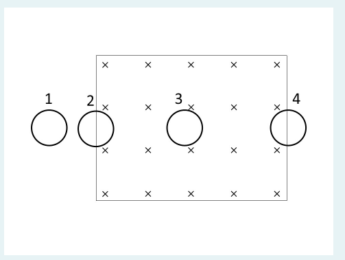 Une boucle de fil se dirige vers la droite pour entrer dans une zone où règne un champ magnétique entrant, uniforme et constant. Le champ est nul partout aux alentours de la zone. Aux endroits indiqués, dans quelle direction circule le courant induit?