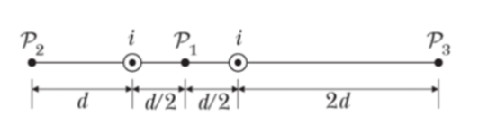 Deux très longs fils parallèles sont parcourus par un même courant i (voir la figure ci-dessous). Classez par ordre croissant le module du champ magnétique aux trois points illustrés (P1, P2 et P3).