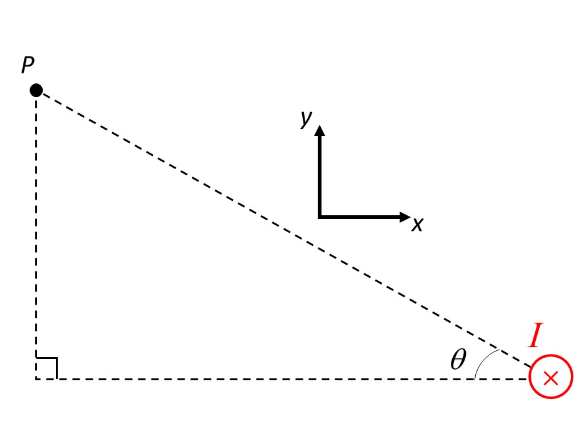 Soit le fil de la figure suivante parcouru par un courant I entrant et situé sur le coin d'un triangle rectangle dont l'angle est θ = 20°. Quel serait l'orientation du champ magnétique produit par se fil au point P illustré sur la figure? Donnez votre réponse par rapport à l'axe des x positif (par exemple, un champ en haut à gauche devrait avoir un angle entre 90° et 180°) arrondie à l'unité près.