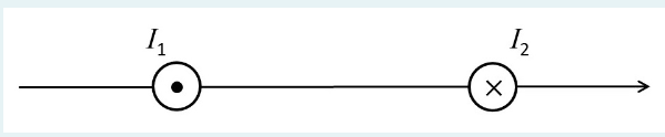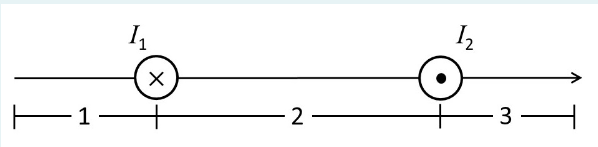 Soient les deux longs fils de la figure suivante parcourus par des courants tels qu'indiqués. Dans quelle région devrait-on placer un troisième fil, dont le courant serait sortant, afin d'annuler la force magnétique sur le fil de gauche (I1)?