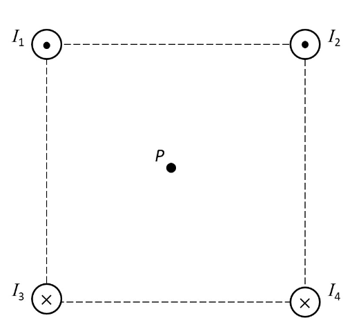 Soient 4 fils sur les coins d'un carré. Les courants sont de grandeurs identiques avec les sens représentés sur la figure. Au point P situé en plein centre du carré, le champ magnétique résultant est nul.