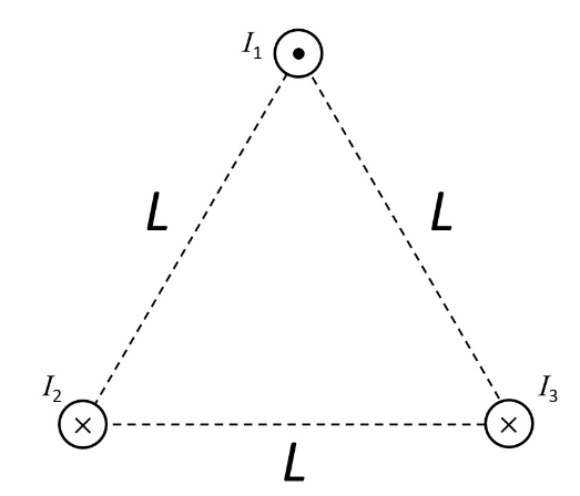 Trois très longs fils de même longueur sont disposés sur un triangle de côté L comme le montre le schéma ci-contre. Les courants sont = 3 A. Le rapport de la force exercée par le fil 1 sur le fil 2 par rapport à la force exercée par le fil 2 sur le fil 1 est de