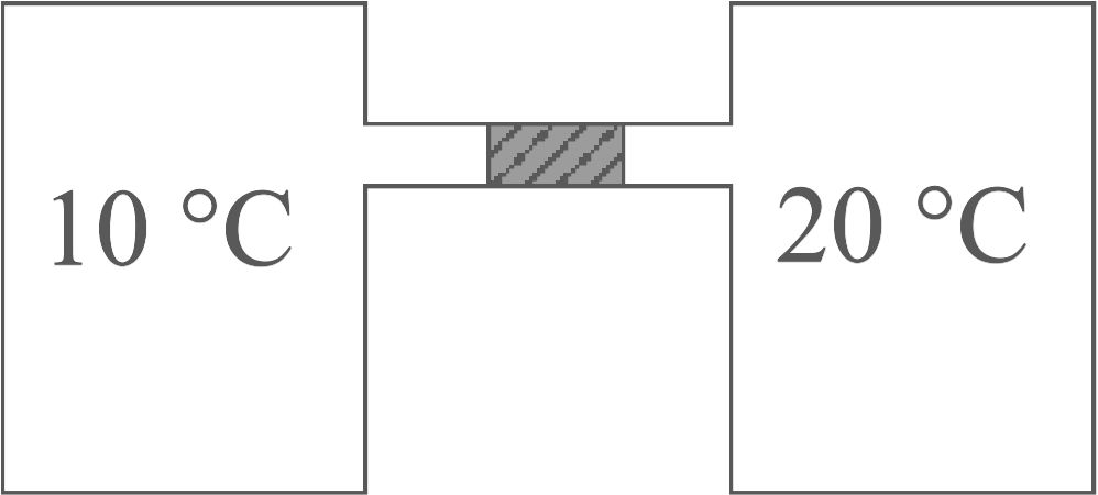 Két, tökéletesen azonos méretű tartályt vékony, vízszintes cső köt össze az ábrának megfelelően. A cső közepén könnyen mozgó higanycsepp helyezkedik el. A bal oldali tartályban 10°C‑os, a jobb oldali tartályban 20°C-os levegő van. Kezdetben a higanycsepp nyugalomban van. Hogyan változik a higanycsepp helyzete, ha a levegő hőmérsékletét mindkét oldalon ugyanannyival emeljük meg?