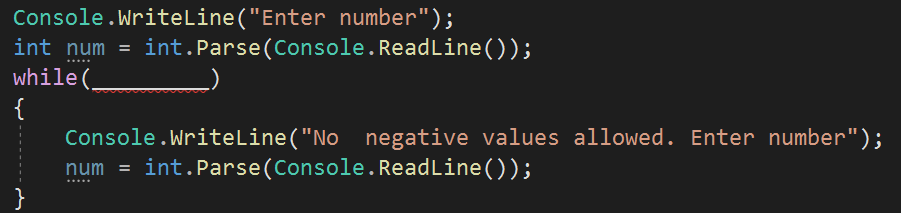 The following code must allow the user to input a value that is positive. Negative value must be rejected and the user must be forced to re-input. Complete the missing while condition.