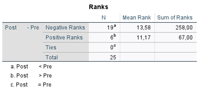 Um investigador mediu os níveis de stress de 25 participantes antes (Pré) e depois (Pós) de uma intervenção de relaxamento.