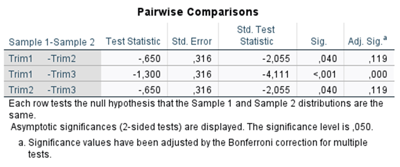 Um investigador avaliou a motivação académica de 20 estudantes em três momentos ao longo do ano letivo: final do 1.º trimestre (Trim1), do 2.º (Trim2) e do 3.º (Trim3).