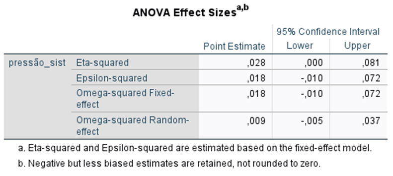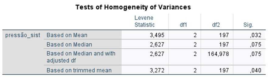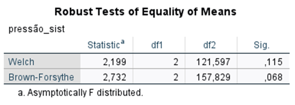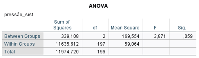 Procura-se perceber se há diferenças nos valores de pressão sistólica entre pacientes de três clínicas diferentes. Assumindo que se verifica pressuposto de homogeneidade das variâncias, e considerando o nível de significância de 5%, selecione a opção que melhor corresponde aos resultados que a seguir se apresentam: