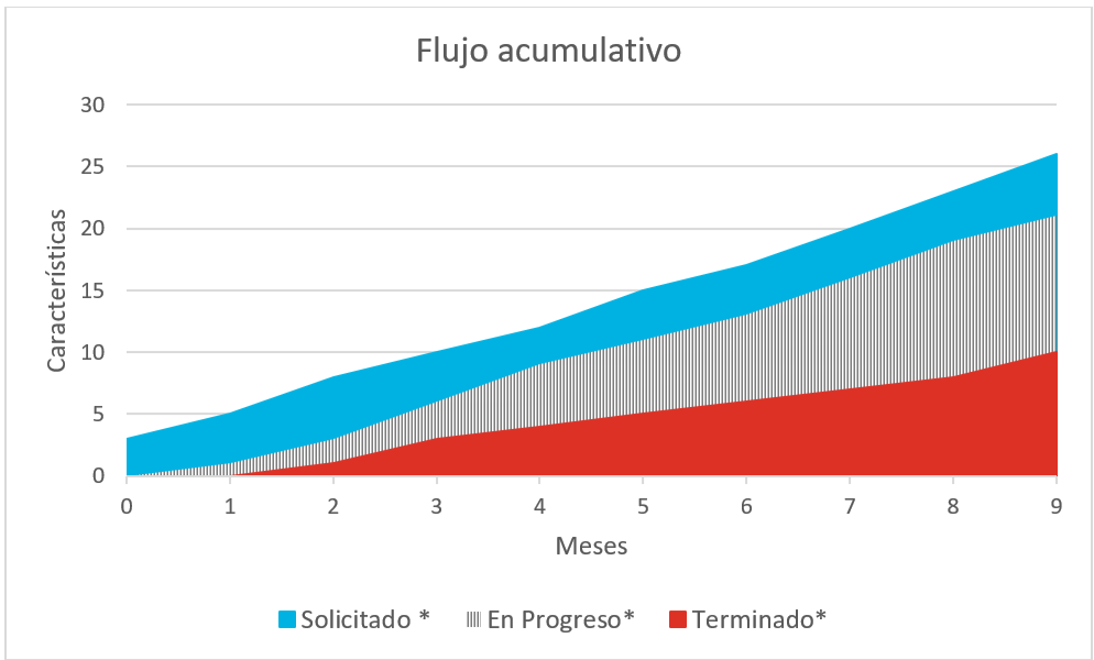 Para el desarrollo de una moneda virtual que reemplazará todos los billetes físicos de un estado, se utiliza el método Kanban. Según el siguiente Diagrama de Flujo Acumulativo de las características completadas, ¿Cuál es la situación del proyecto al mes 8?